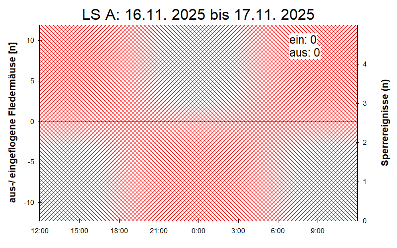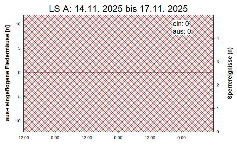 Dargestellt ist die Aktivität der letzten 180 Nächte an einem Winterquartier im westlichen Münsterland. Die Balken zeigen die Nachtsummen der Ein- und Ausflüge, ermittelt durch eine Chirotec-Lichtschranke.