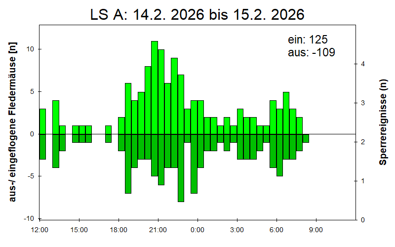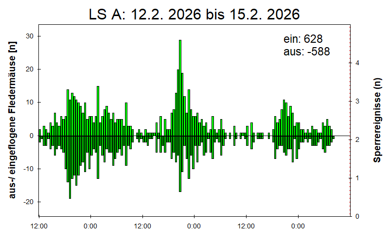 Dargestellt ist die Aktivität der letzten 180 Nächte an einem Winterquartier im westlichen Münsterland. Die Balken zeigen die Nachtsummen der Ein- und Ausflüge, ermittelt durch eine Chirotec-Lichtschranke.
