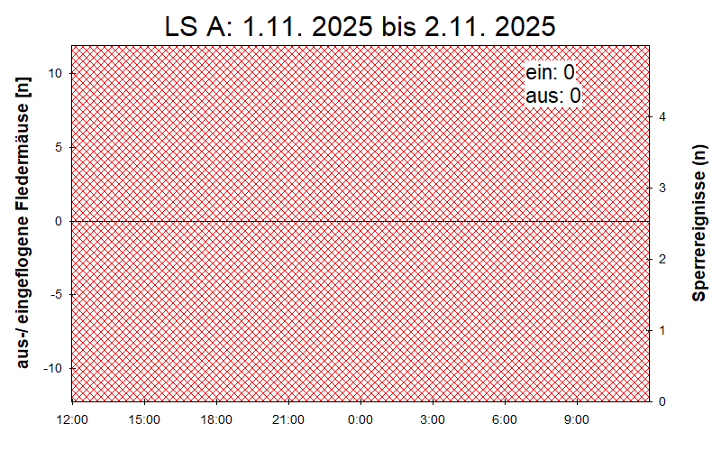 Dargestellt ist die Aktivität der letzten 180 Nächte an einem Winterquartier im westlichen Münsterland. Die Balken zeigen die Nachtsummen der Ein- und Ausflüge, ermittelt durch eine Chirotec-Lichtschranke.