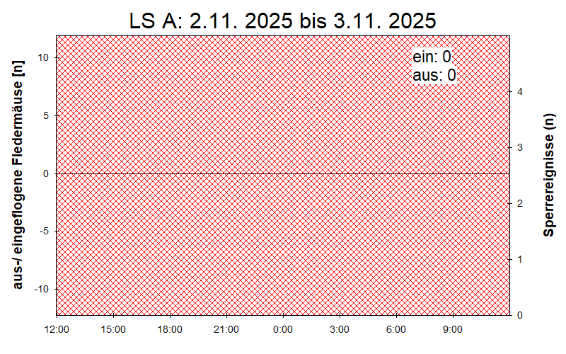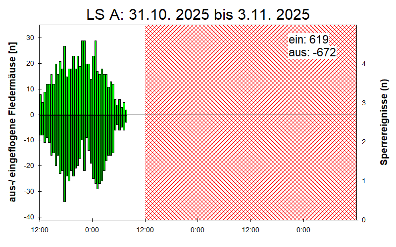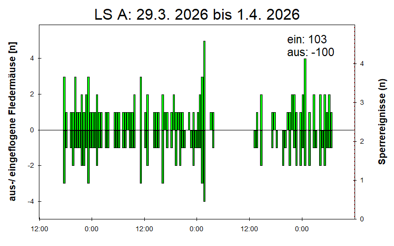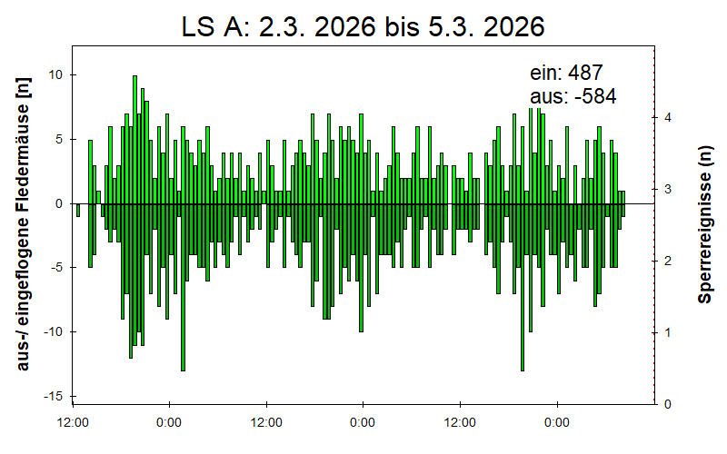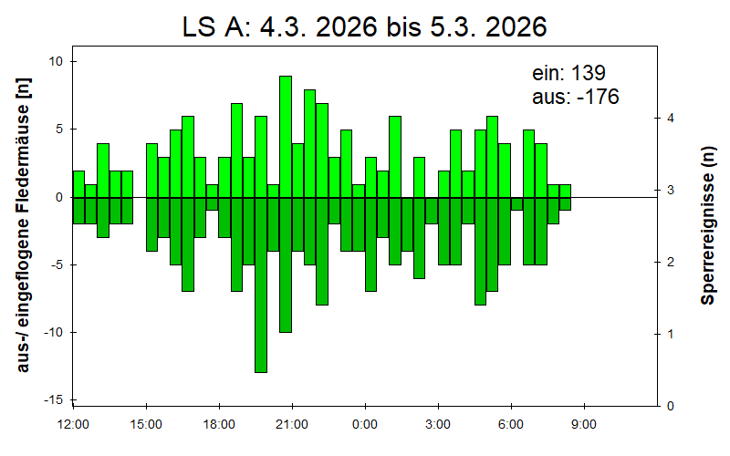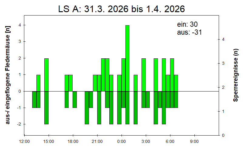 Dargestellt ist die Aktivität der letzten 180 Nächte an einem Winterquartier im westlichen Münsterland. Die Balken zeigen die Nachtsummen der Ein- und Ausflüge, ermittelt durch eine Chirotec-Lichtschranke.
